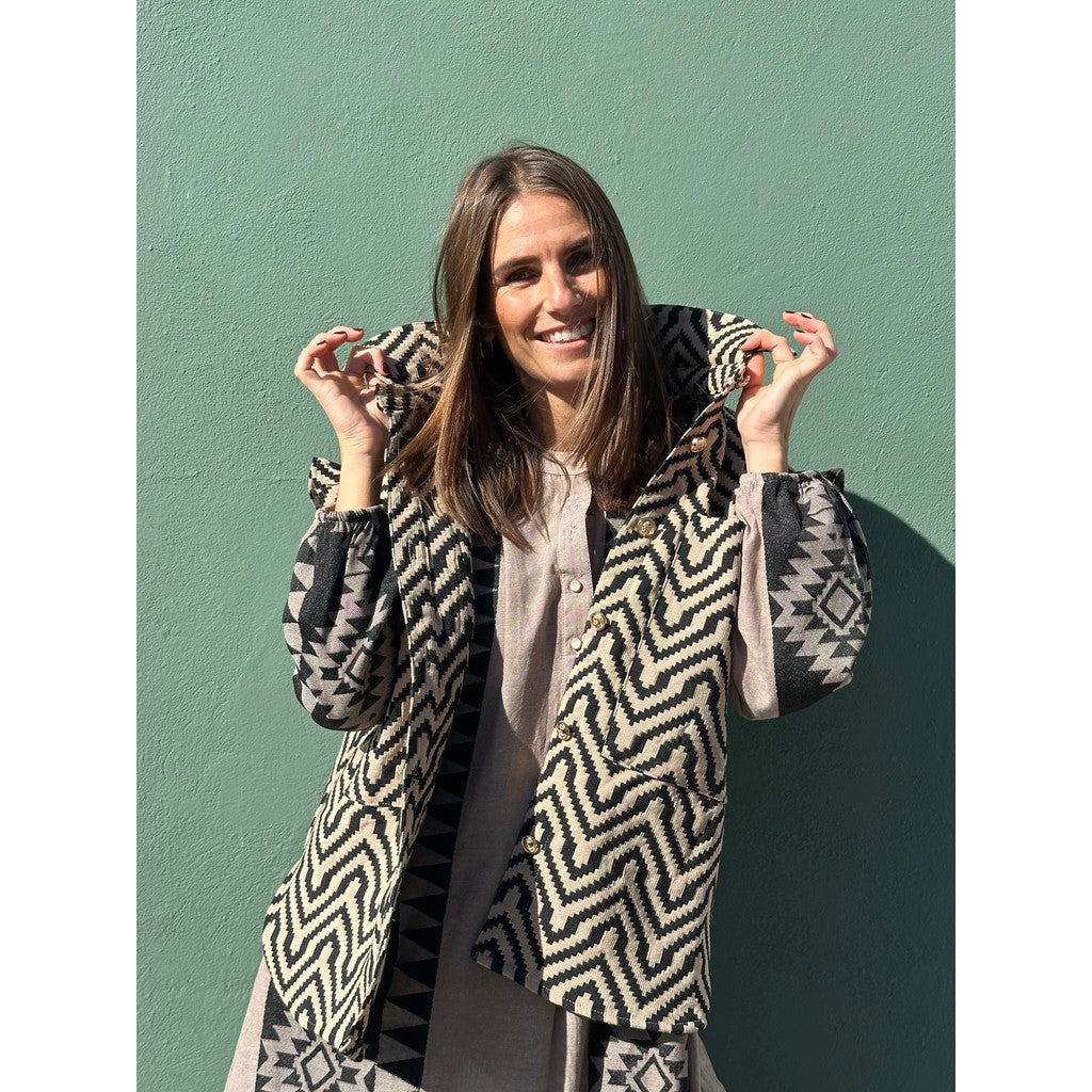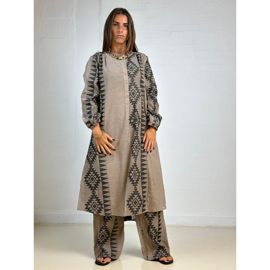 Ærmerne afsluttes med elastik, der giver et let puf og en behagelig pasform. Modellen er lidt kortere foran end bagpå og har en let afrundet kant, som skaber et flot fald og bevægelse. Praktiske sidelommer tilføjer funktionalitet uden at gå på kompromis med stilen.