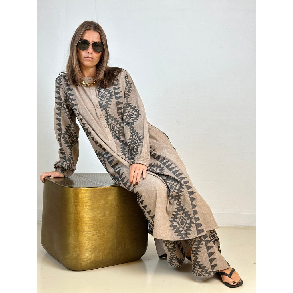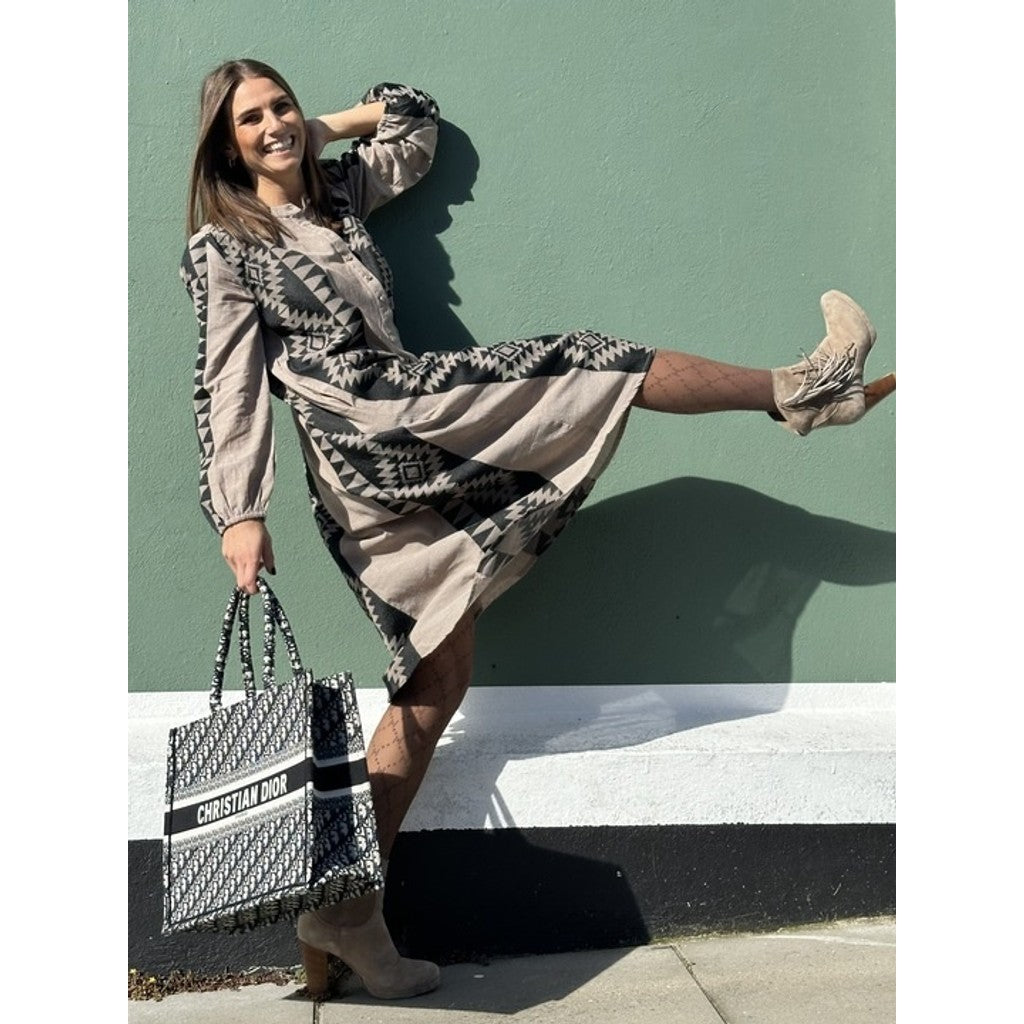 Lækker og stilfuld langærmet kjole i en eksklusiv jacquardvævet kvalitet, der føles let og luksuriøs mod huden. Kjolen har en feminin stolpelukning med matte guldknapper, som tilføjer et sofistikeret touch.
