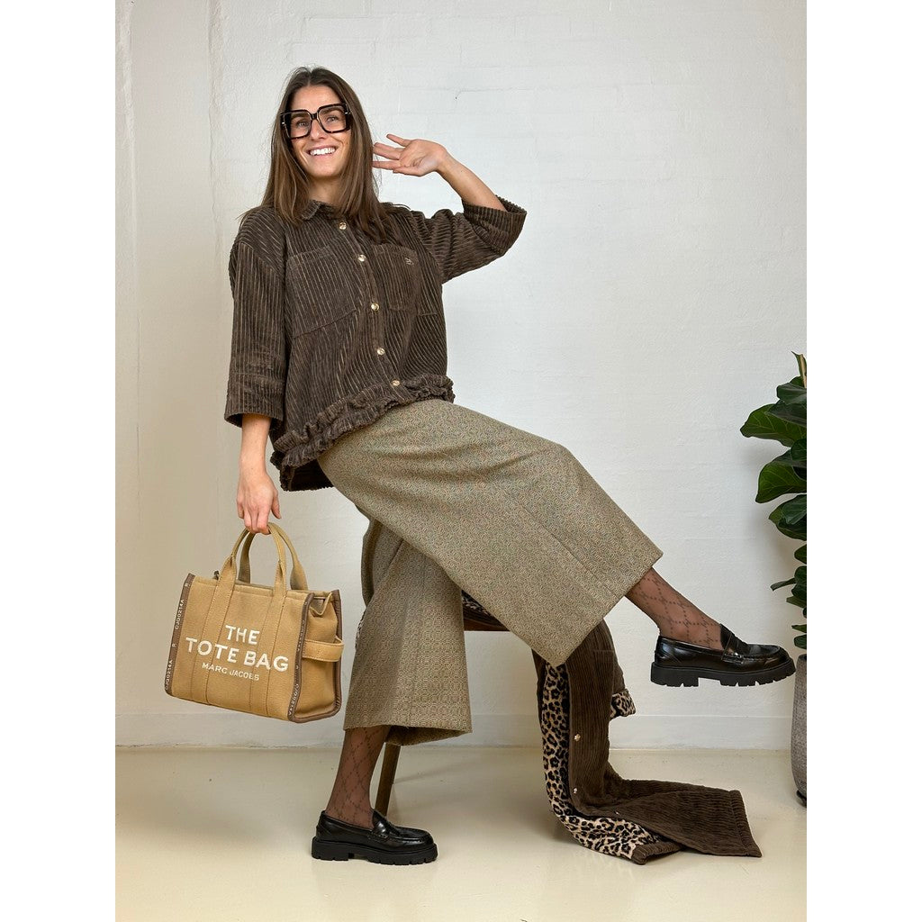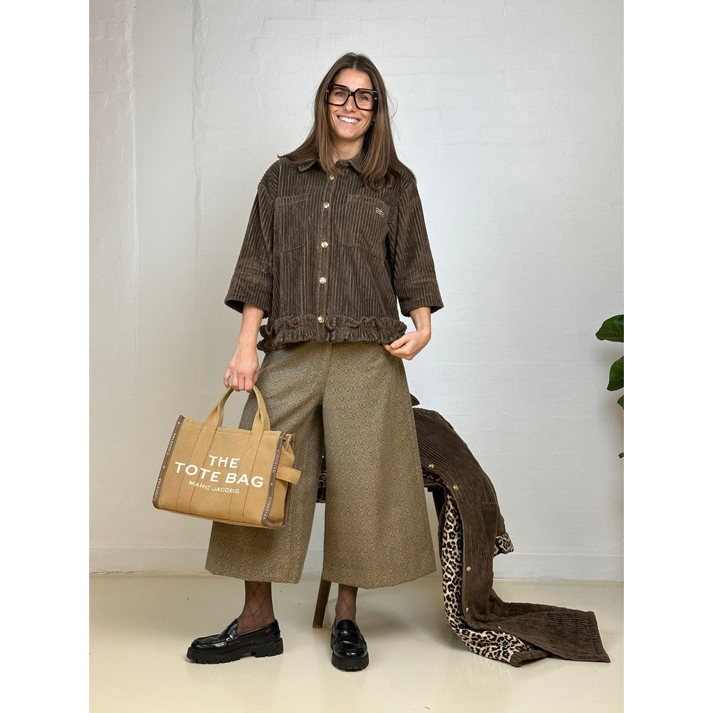 Taljen er udstyret med bæltestropper, så du nemt kan tilføje et bælte efter stil og behov, samt elastik i siderne for ekstra komfort og fleksibilitet.