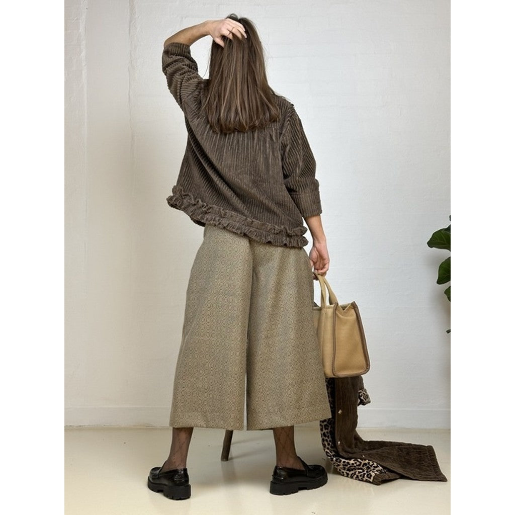 Disse stilfulde knickers i 100% uld kombinerer klassisk skrædderi med et moderne twist. Modellen har et fast bærestykke med lynlås og en flot guldknap foran, som giver et stilrent udtryk og en velsiddende pasform.
