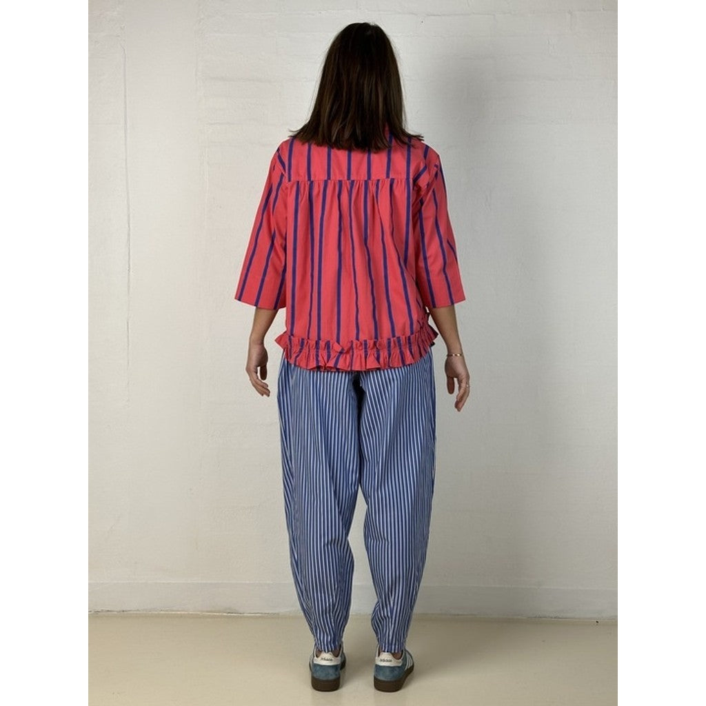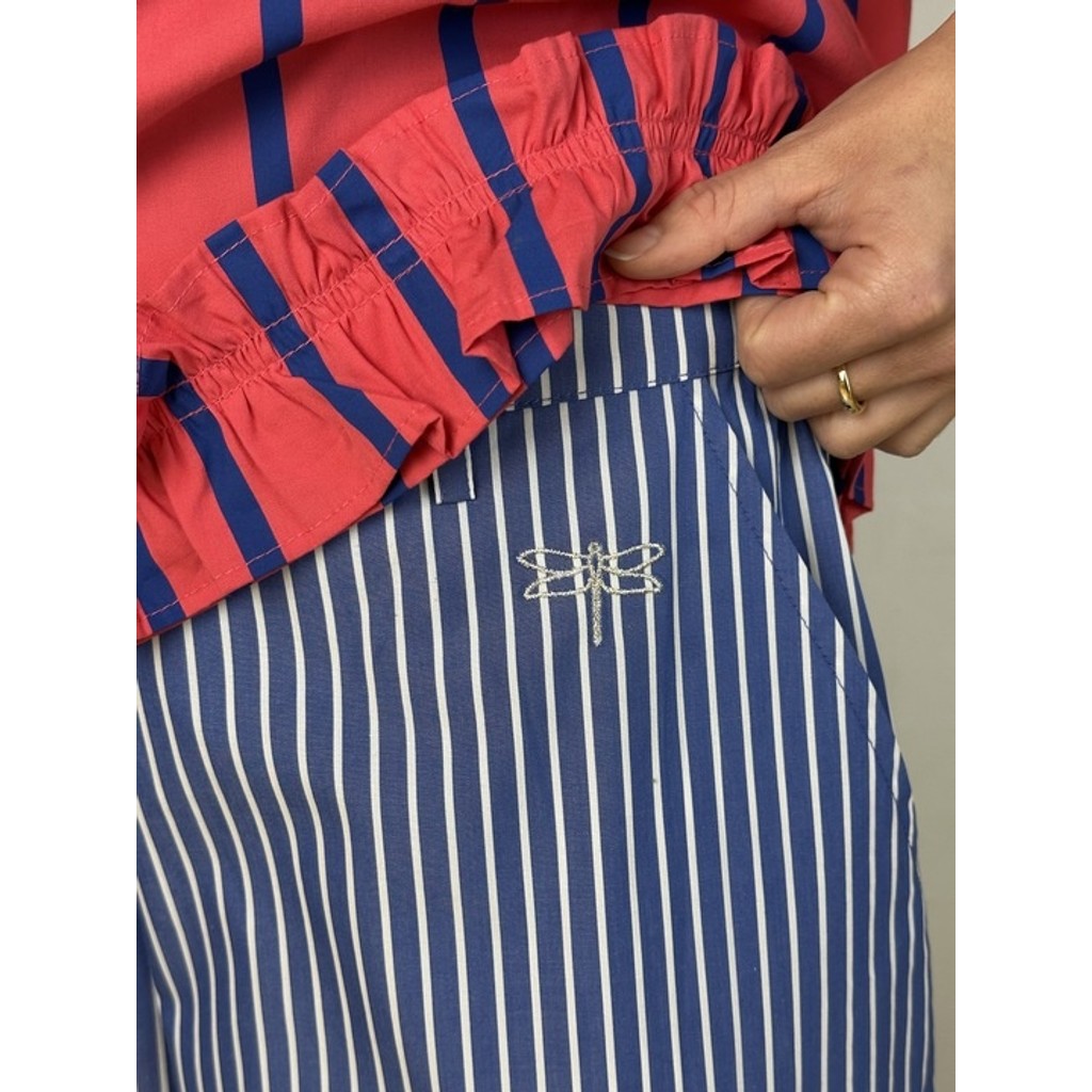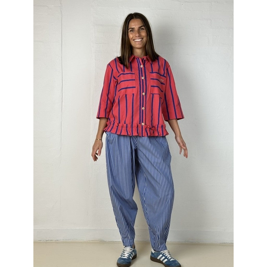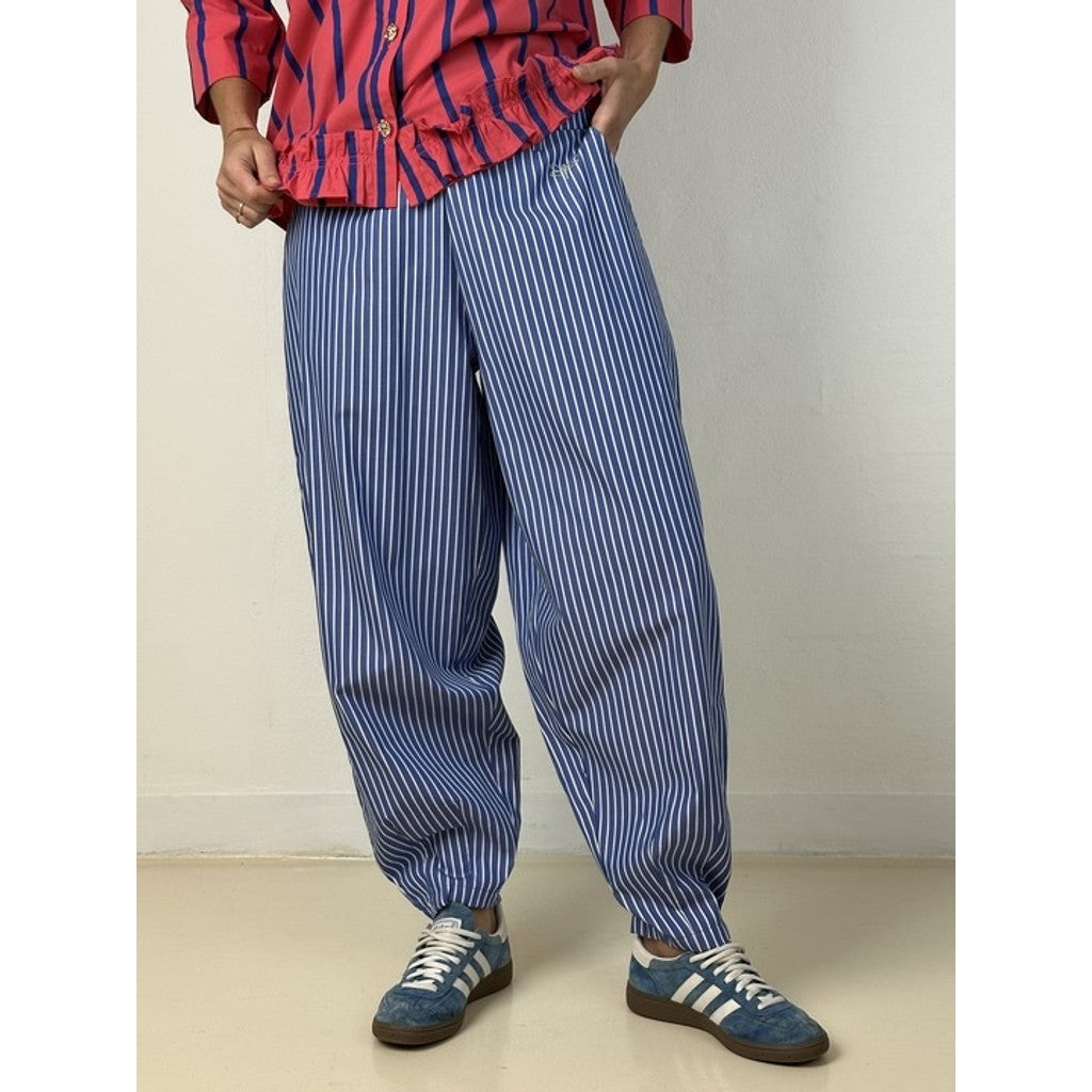 Colorado Barrel-bukser i blød bomuldspoplin har et afslappet, men stilfuldt snit med god vidde i lårene og en smallere afslutning ved anklerne. Modellen er let stumpet og giver et cool, moderne udtryk. Bukserne er blå med hvide striber, som understreger det moderne og tidløse look.