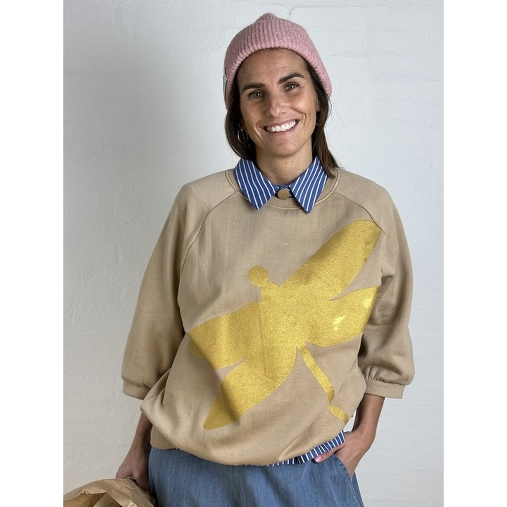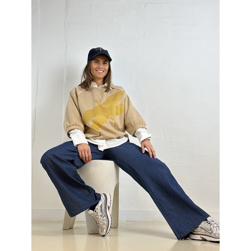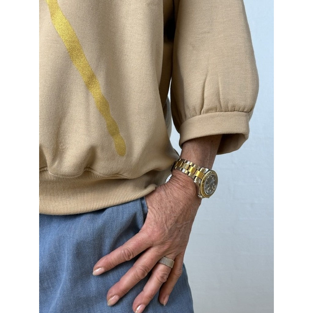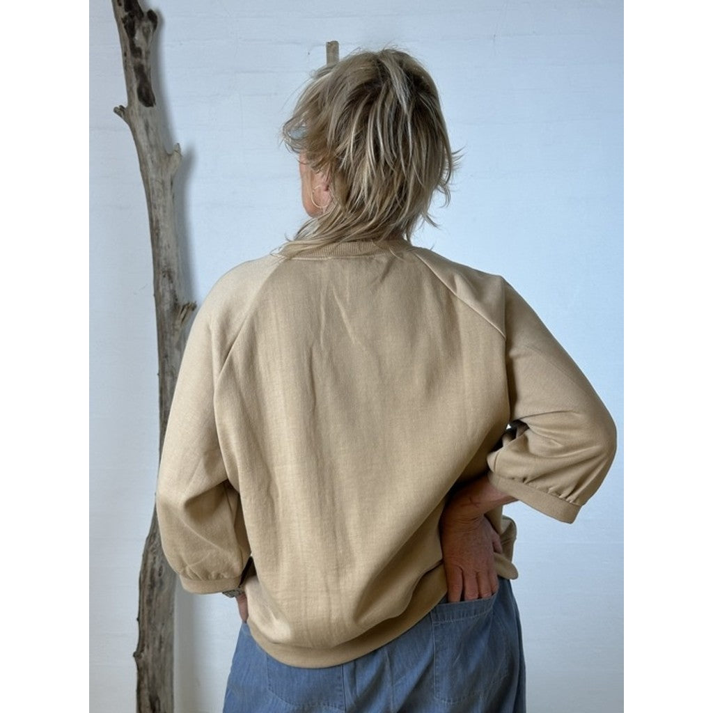 Sweatshirten er designet med raglanærmer i mellemlang længde, som skaber en blød overgang over skuldrene og understøtter den afslappede silhuet. Den let formede afslutning på ærmerne giver volumen og et feminint modspil til det afslappede, sporty udtryk, uden at gå på kompromis med komforten.