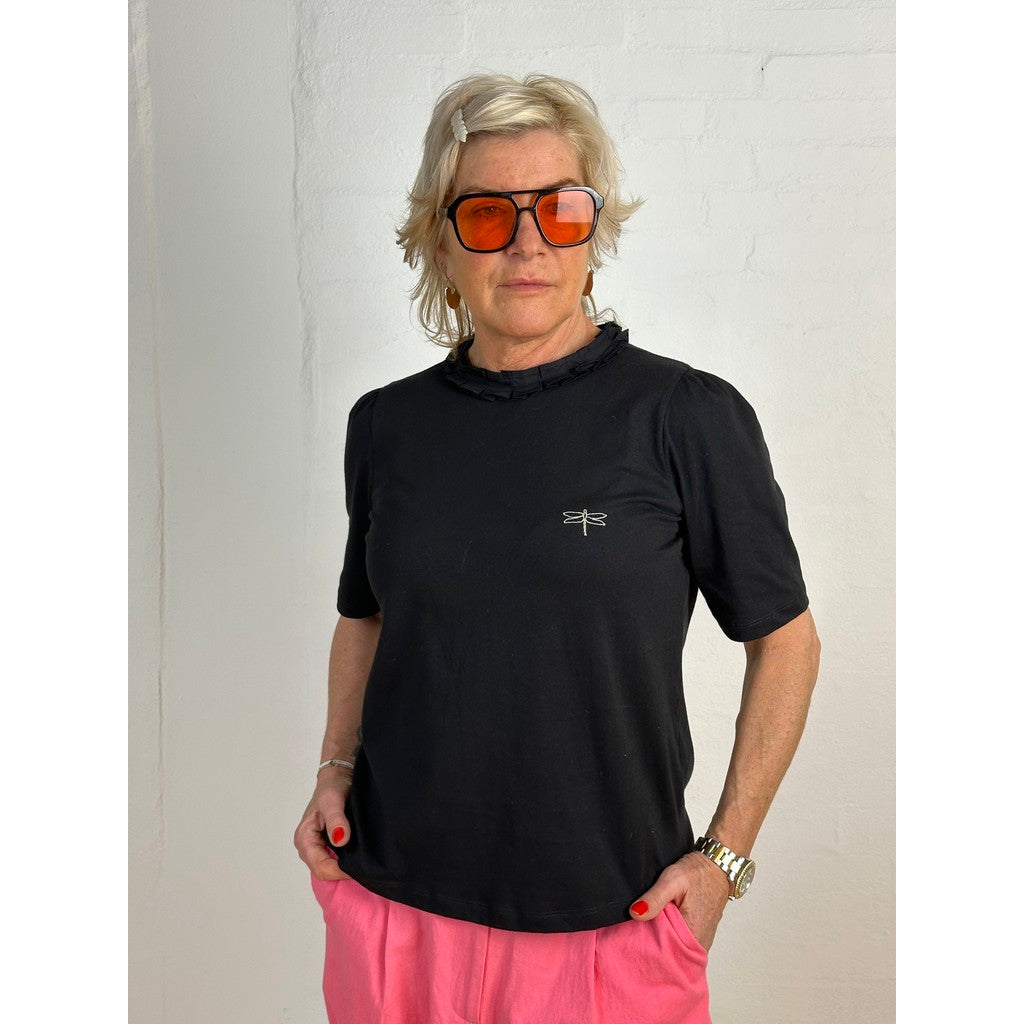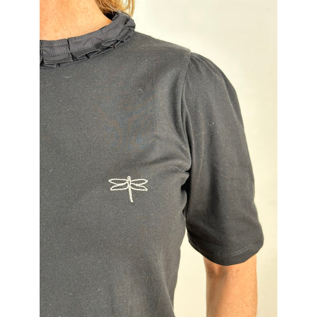 Toppen er kendetegnet ved den smukke flæsekrave, som giver et sofistikeret og feminint look uden at virke overdrevet. I nakken har Fresno Top en diskret knaplukning med lille åbning, der både er praktisk og tilfører et let, elegant touch til designet.