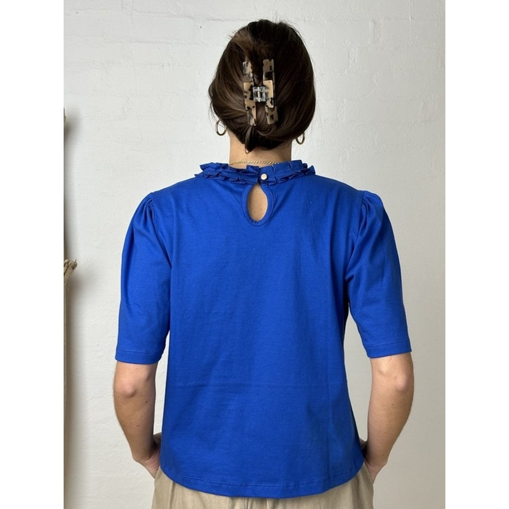 Toppen er kendetegnet ved den smukke flæsekrave, som giver et sofistikeret og feminint look uden at virke overdrevet. I nakken har Fresno Top en diskret knaplukning med lille åbning, der både er praktisk og tilfører et let, elegant touch til designet.