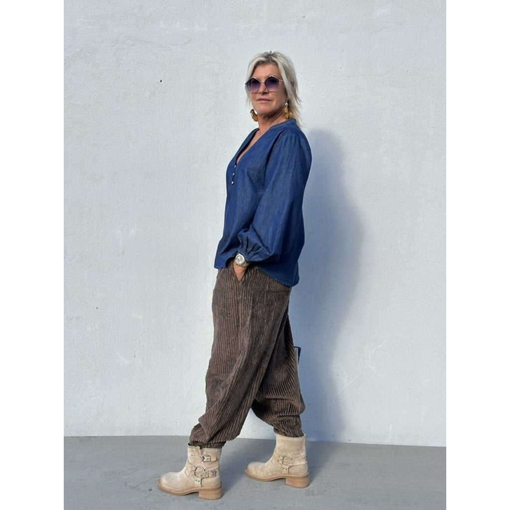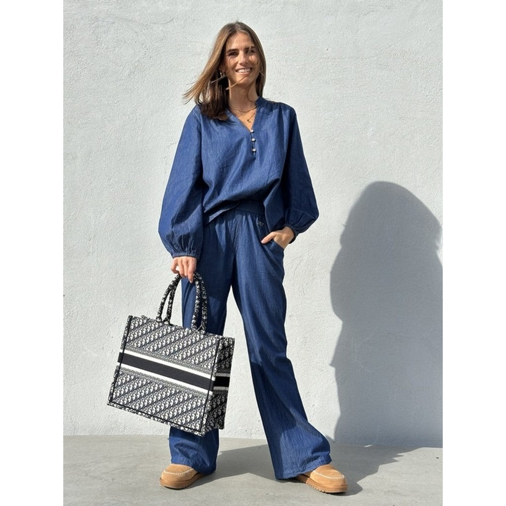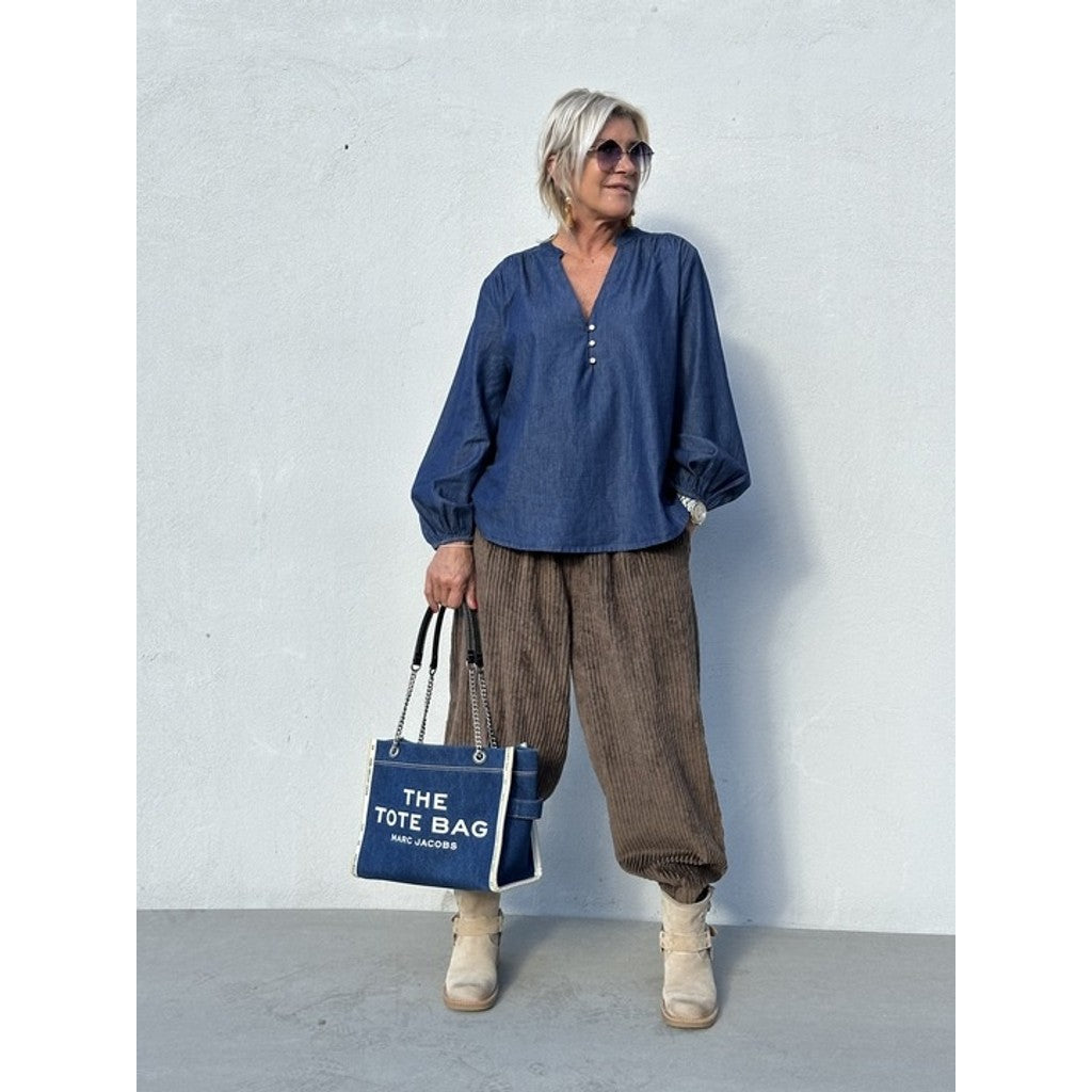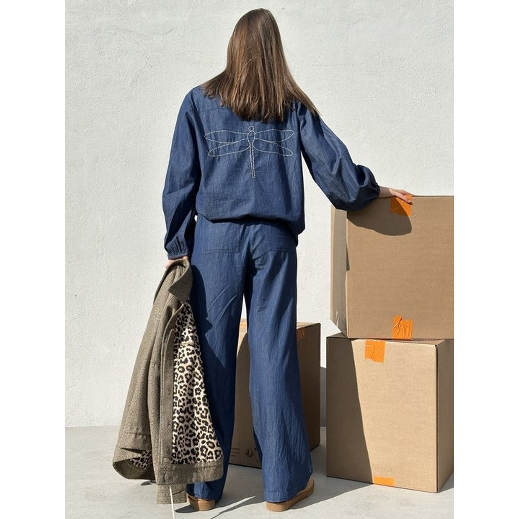 En moderne og cool denimskjorte med kinakrave og v-udskæring, der giver et let og sofistikeret look. Skjorten har en stolpelukning foran med matte guldknapper, som tilføjer et eksklusivt touch.