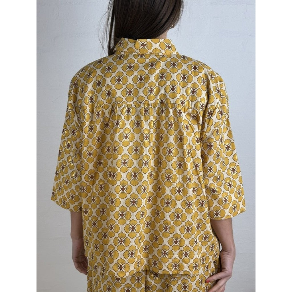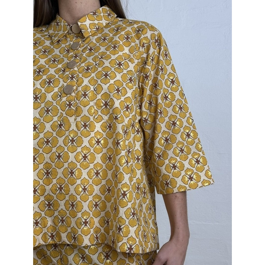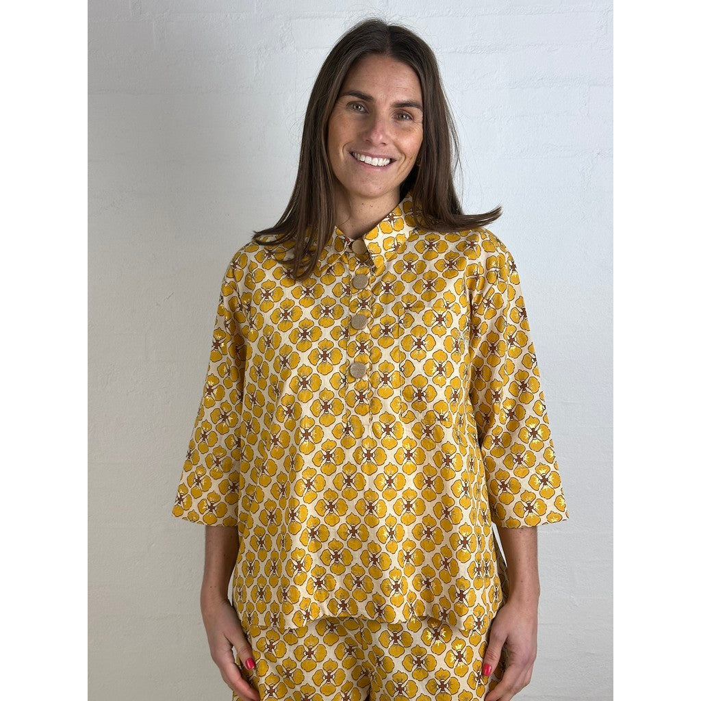 Blusen har en klassisk krave og en kort stolpelukning foran med smukke, matte knapper, som tilfører et eksklusivt og gennemført udtryk. De 3/4-lange ærmer har en let vidde, der understreger det sofistikerede og ubesværede look.