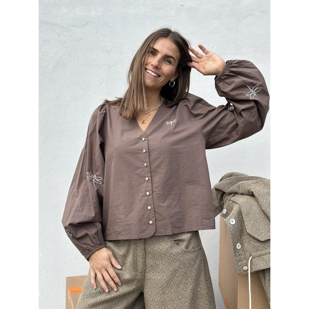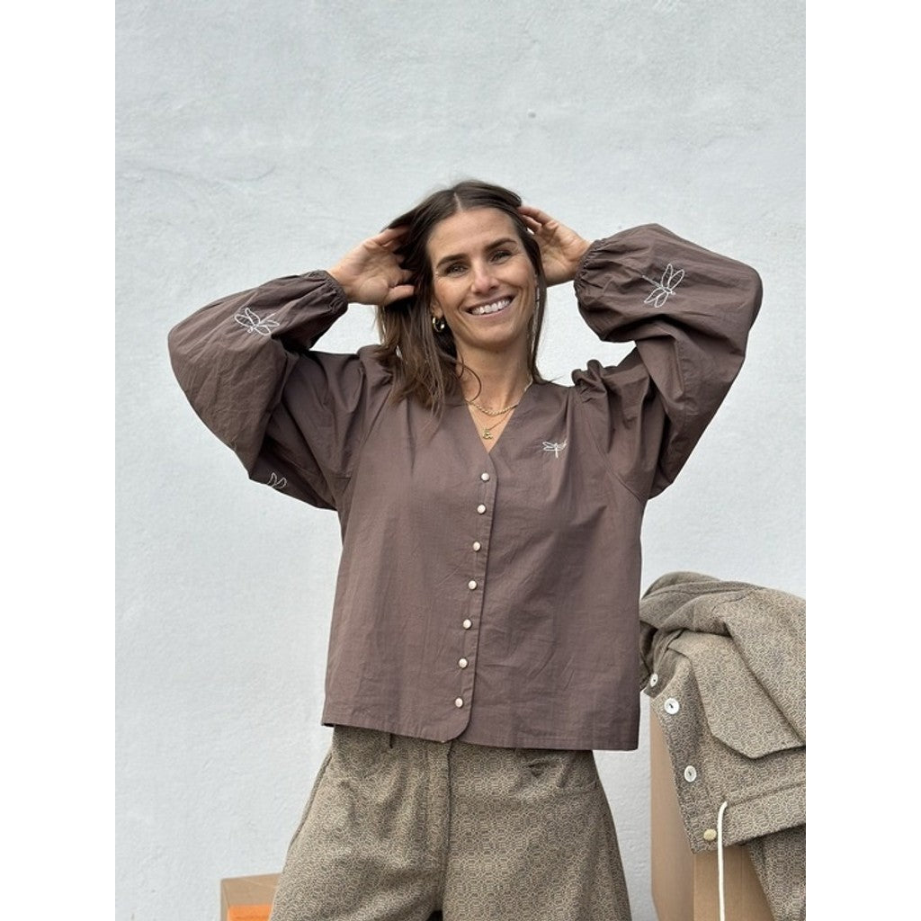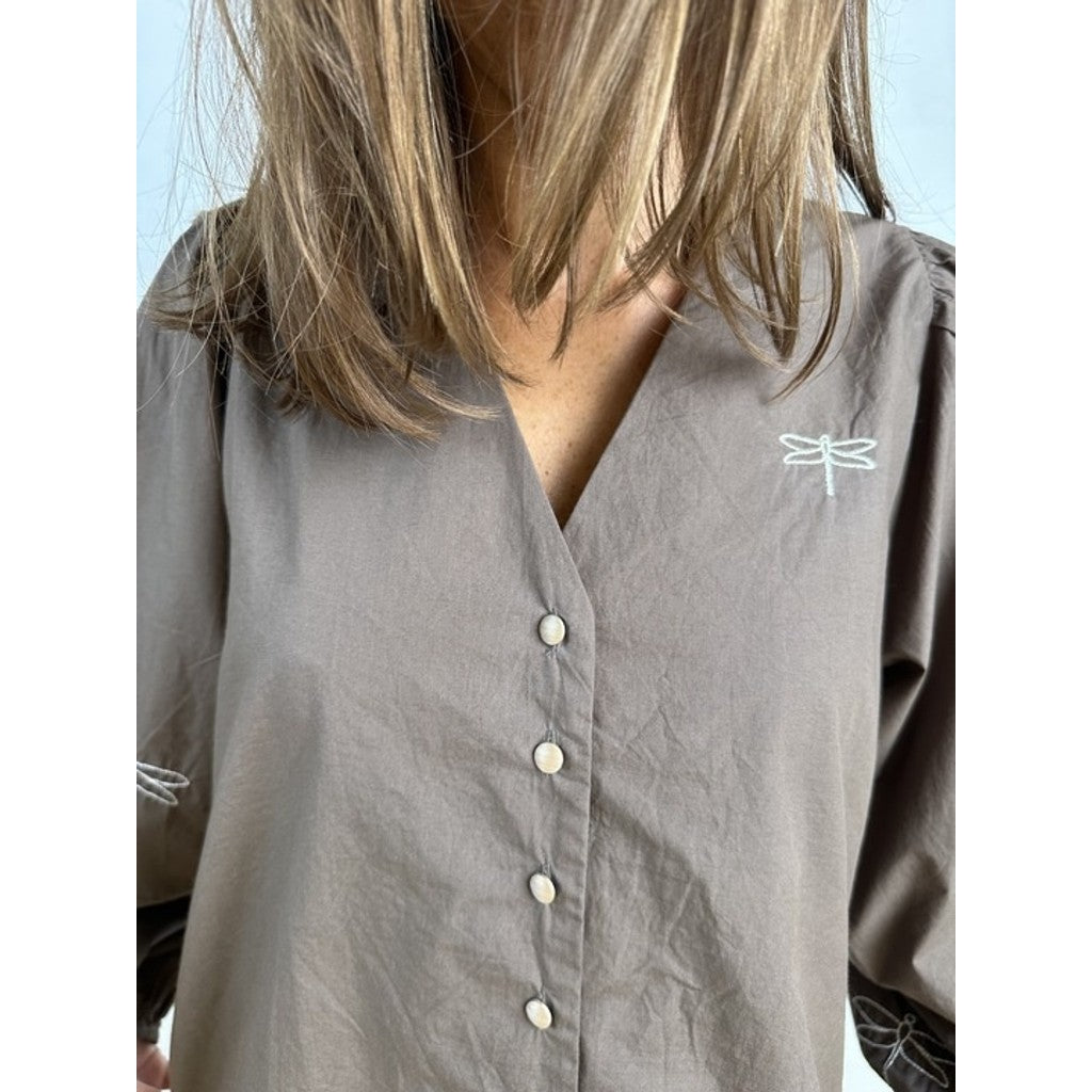 En smuk og let kort skjorte i blød bomuld, designet med en elegant v-hals, der giver et sofistikeret udtryk. Modellen har ballonærmer med elastik i enden, som skaber en flot, puffet effekt.